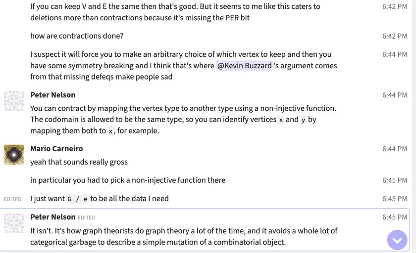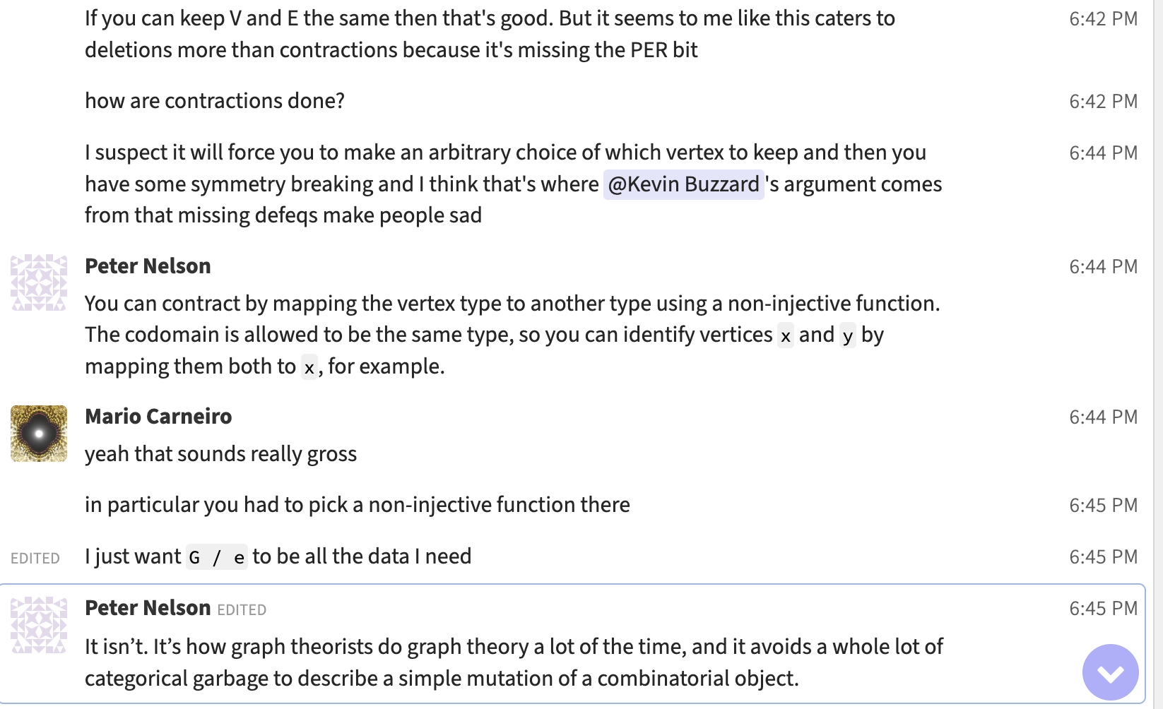 Furthermore, having to control what happens to the vertices indirectly via the labels is not great. For example, given S : Set α, I would like to find δ(S), the edge cut of S, the set of edges with exactly one end in S. Previously, it can be defined as {e | ∃ u v, u ∈ S ∧ v ∉ S ∧ G.IsLink e u v} (the set of edges between two vertices, one in S and another outside S). With this setup, it would have to be {e | ∃ u v, u ∈ S ∧ (v ∉ S ∧ ∀ w ∈ S, ¬ vertexRel v w) ∧ G.IsLink e u v} (the set of edges between two vertices, one in S and another not only outside S but also not vertex-related to any vertex in S). Also, every time we define a new property/function on graphs, we have to prove a lemma that the outputs agree when rewriting a label with a vertex-related one. These are problems that arise repeatedly, even in parts of the API that have nothing to do with contraction/identification. I am not saying it can't be done, but these are added complexities that do not exist in the usual graph theory.