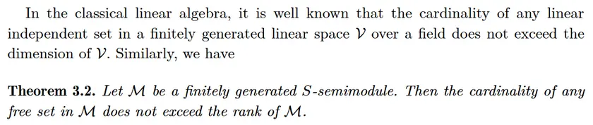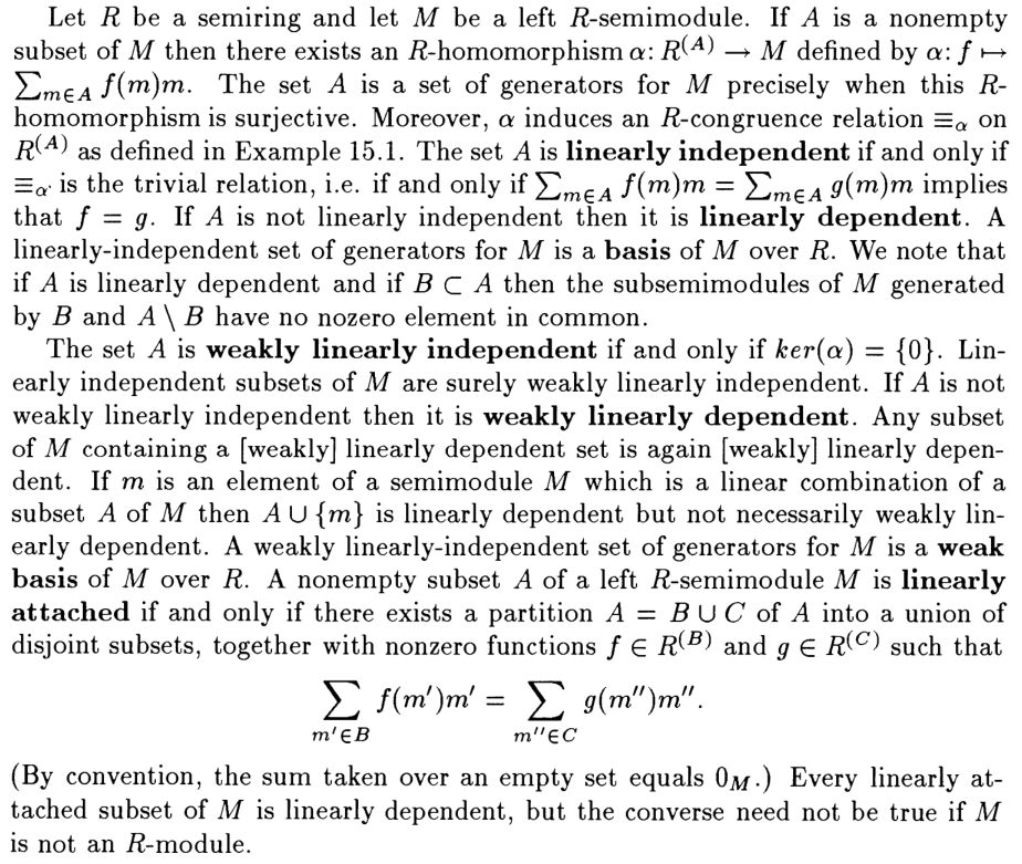 A 2016 paper I found yesterday uses the same definition of linear independence, and mathlib's docs#LinearIndependent is called "free" there. (Mathlib's docs#Basis is called "free basis", and docs#Submodule.spanRank is called "rank".) With this dictionary in mind, Theorem 3.2 of the paper implies that nontrivial commutative semirings satisfy the strong rank condition, answering a MO question of mine. It looks like the proof depends on 14 pages of the paper plus an 2013 paper by the same author and a 2004 paper (update: all that are needed in this paper seem to be included in @Thomas Browning's work in #19581), so it will be a nontrivial effort to formalize the result.