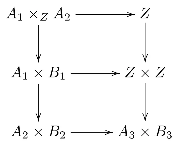 The bottom square is obtained as a binary product of two pullback squares, and the top square relates the fiber product and the binary product via the diagonal of Z.