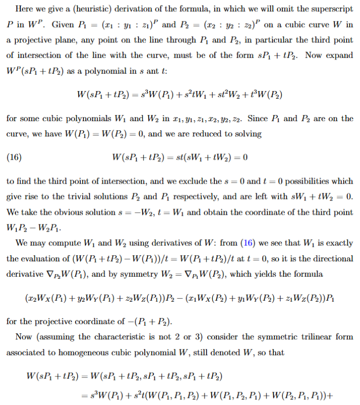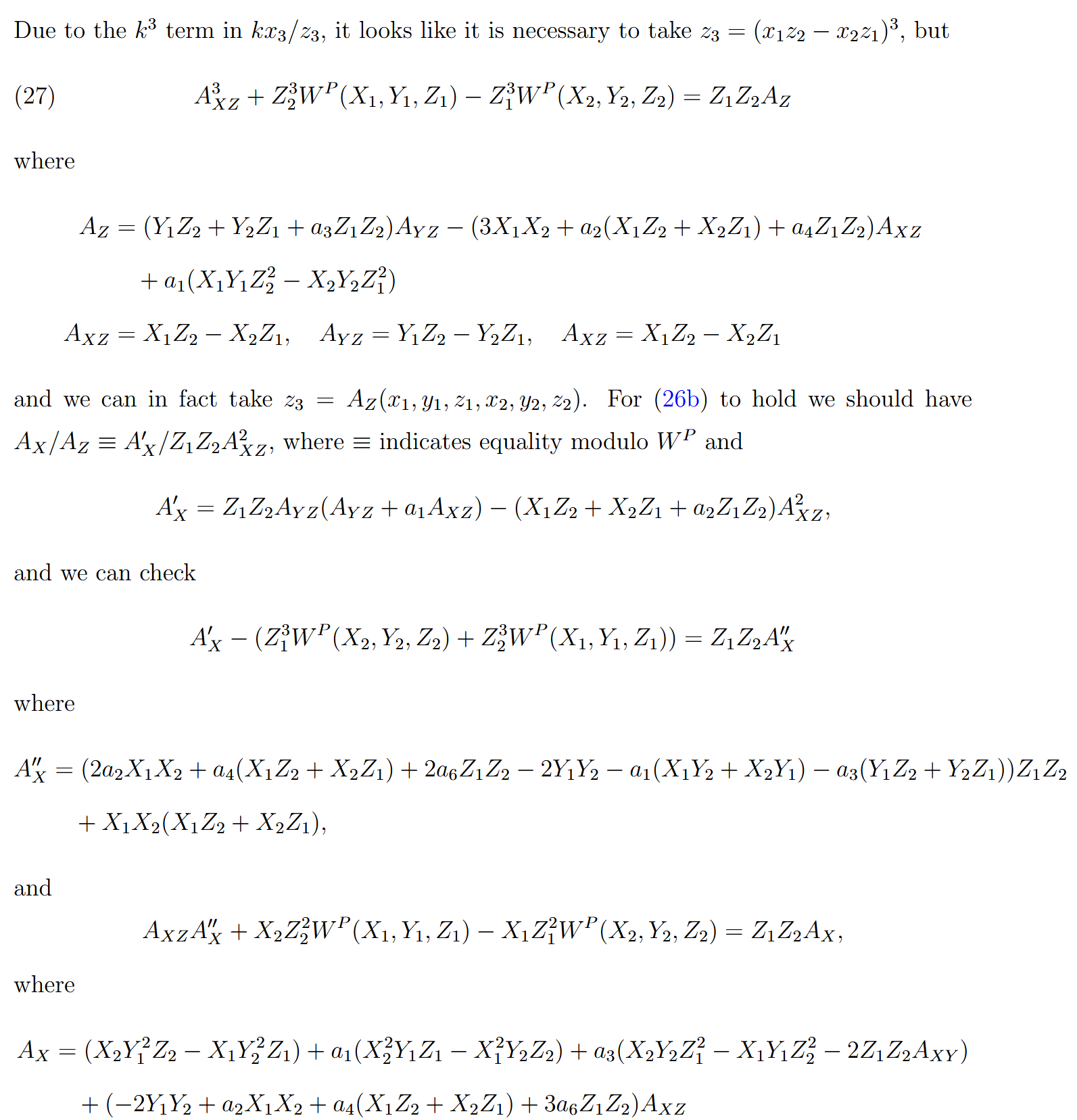 For (2) this boils down to an identity of ideals -- if (x1,y1)+(x2,y2)=(x3,y3) addition on the curve, then we want to write down explicit f and g (linear) such that . This looks to me to be much easier algebra.