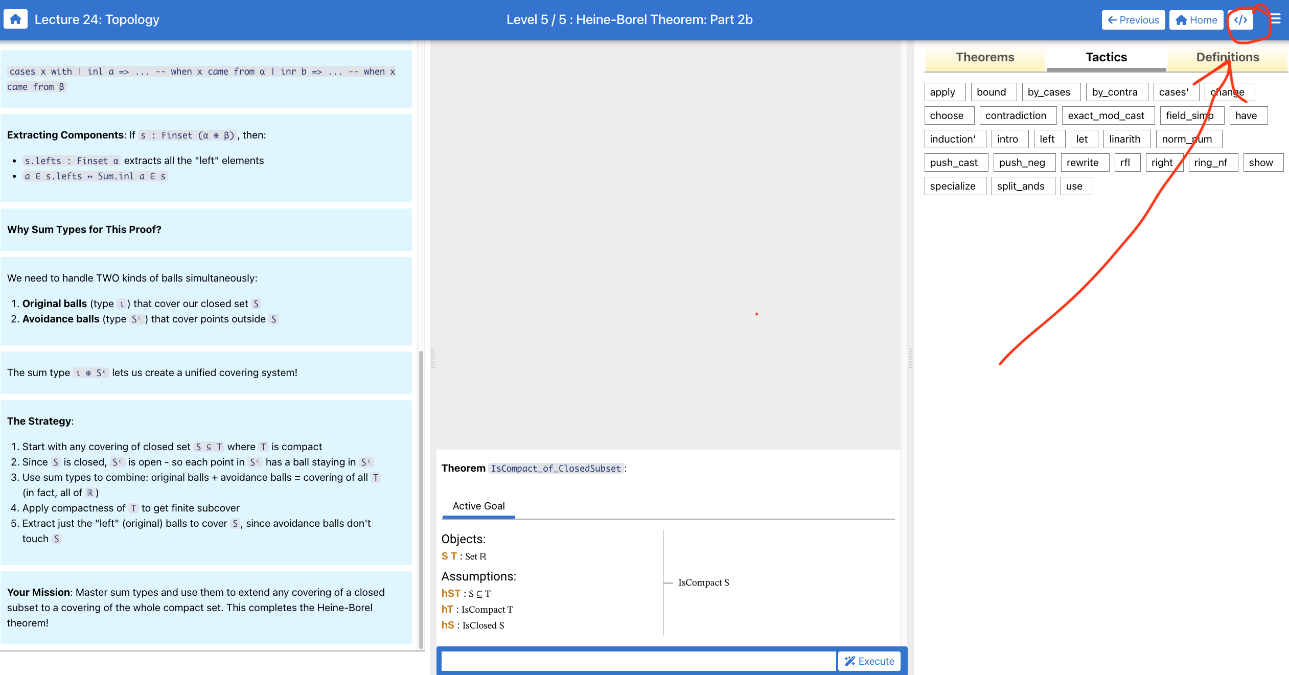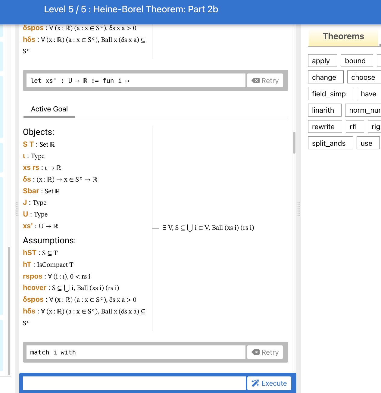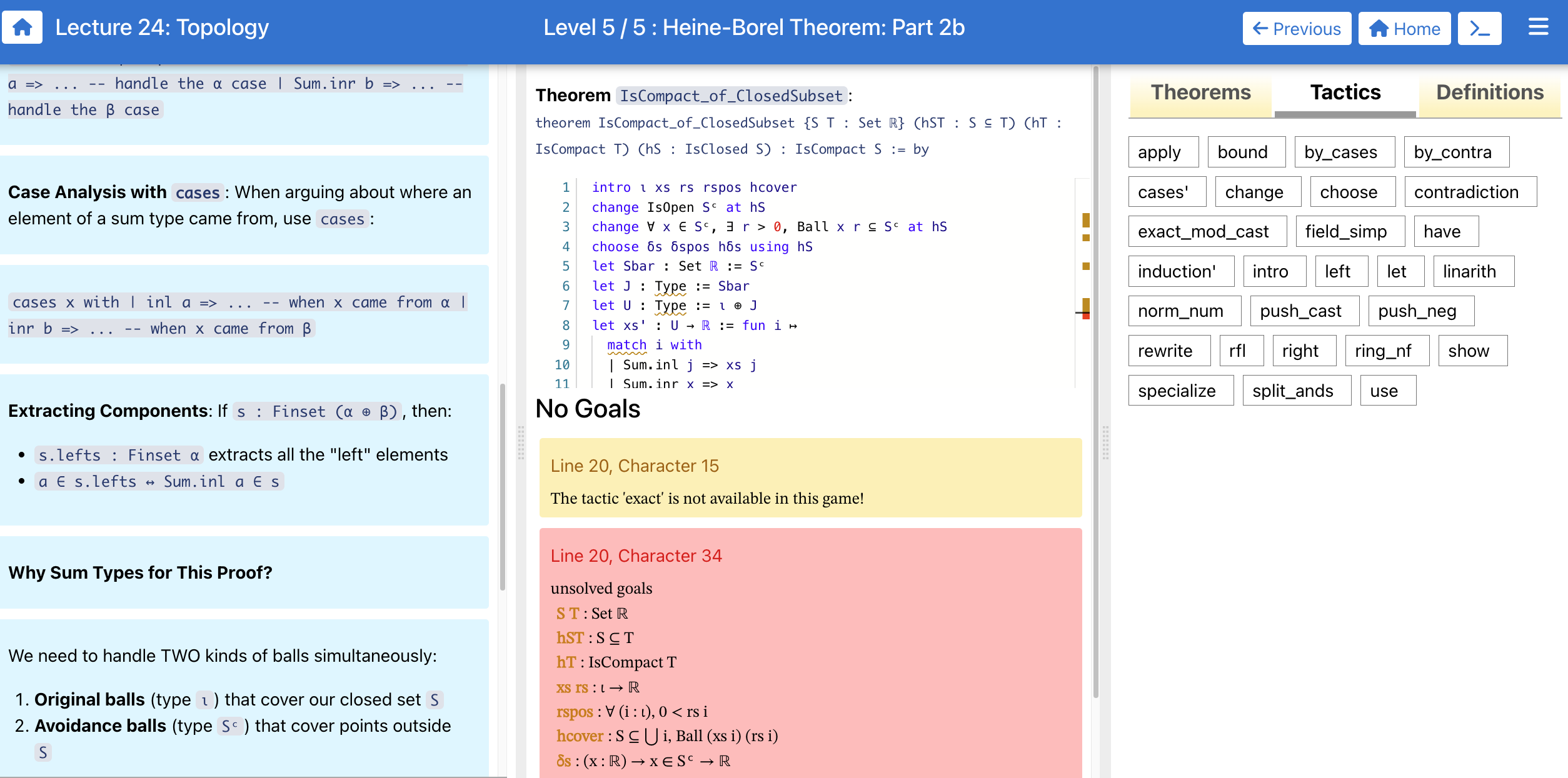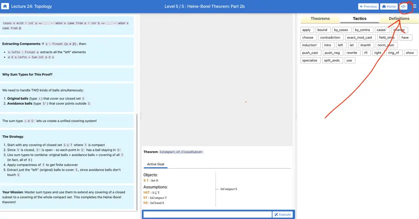 In the screenshot about Heine-Borel, it looks like game players might be able to write multiline let proofs using a case split to solve the level? If so, could you point me to the source code and let me know how you set this up? I wasn't aware that this sort of thing was possible with the Lean game server interface.