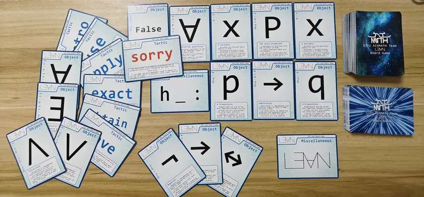 I designed a board game based on the mechanisms of tactic proof, as shown in the photos below. The original intention was to help the beginners memorize the tactics quickly to prove propositions of logical operators. But since I posted a photo of our team testing the game in a chat group, many people have shown great interest and would like to get the cards or the design.