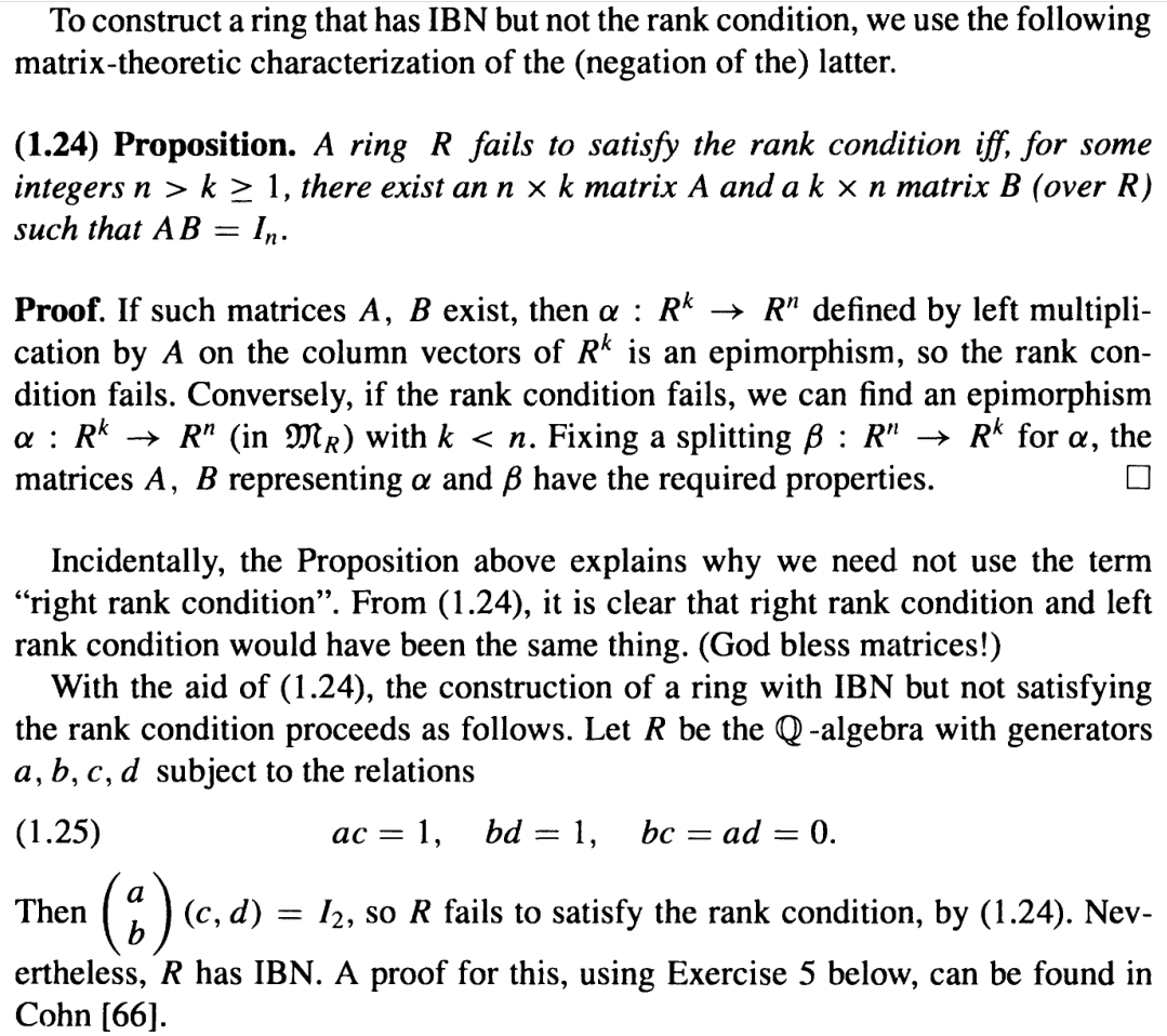 Out of curiosity, what is an example of a ring that has the invariant basis number property but it doesn't satisfy the rank condition?
