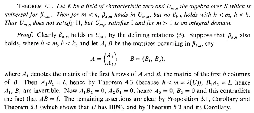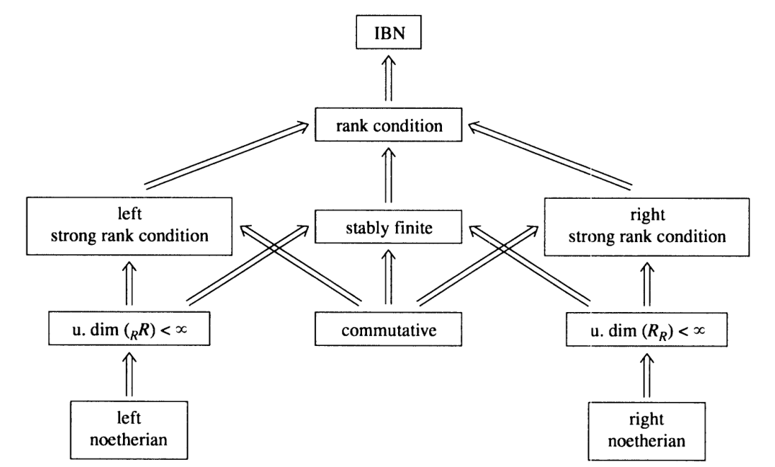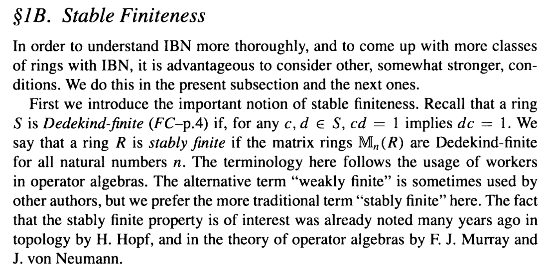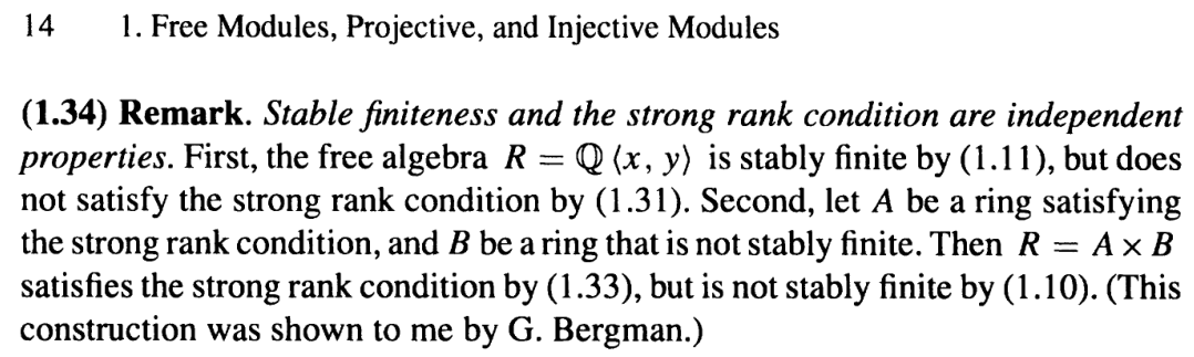 Oh this is called "stably finite" in GTM 189. It's stronger than docs#RankCondition but neither weaker nor stronger than docs#StrongRankCondition. OrzechProperty implies StrongRankCondition and therefore stably finiteness.