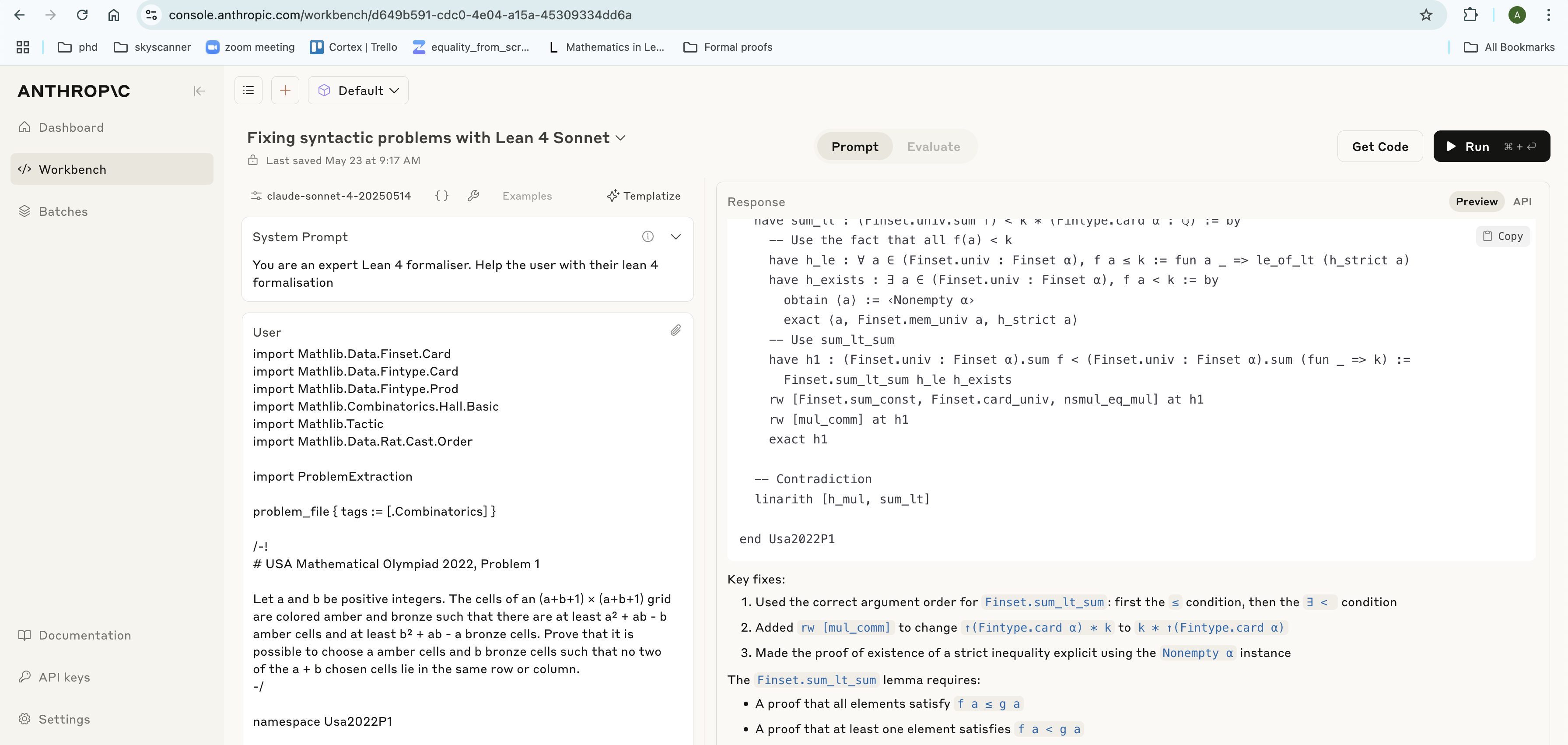The biggest issue so far seems to be the cost. It cost me ~10 USD to get ~400 lines of lean proof (I expect final version will be ~1000). Still cheaper than undergraduates ;)
