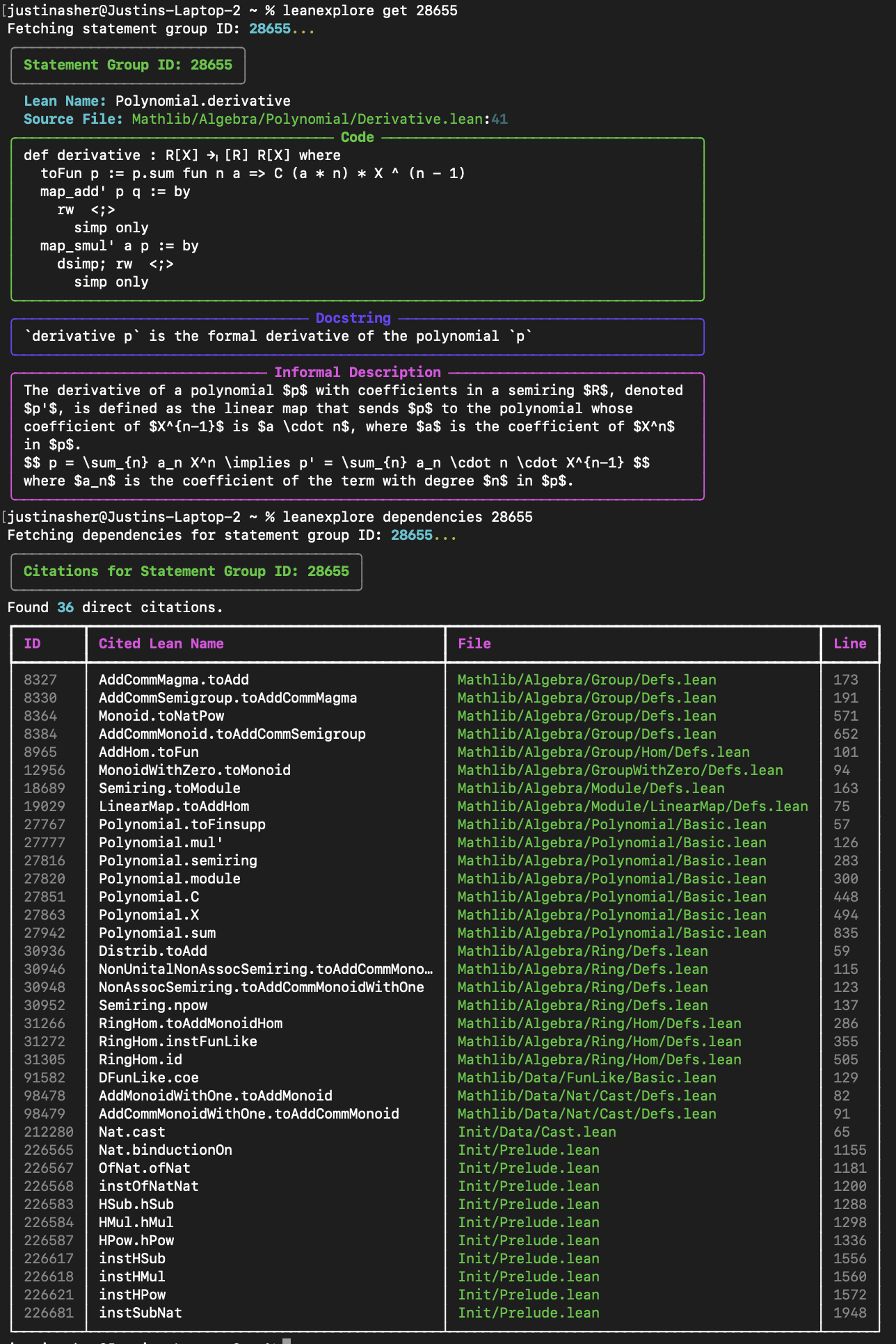 One useful feature I implemented is both the ability to get a Lean statement and get information about its dependencies (i.e., the declarations that it cited). This helps a lot for the model at understanding statements. The models will have access to more and more information as what I index expands in the future.