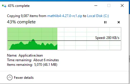 About 20 minutes ago, and it's still running. When I saw a lot of console traffic, I felt like an internet god with my T-mobile data plan on my phone. Now it seems to be stuck at a removing corrupted file line -_-. Can we possibly get Mathlib in small chunks?
