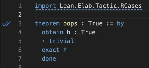 theorem oops : True := by obtain h : True · trivial exact h