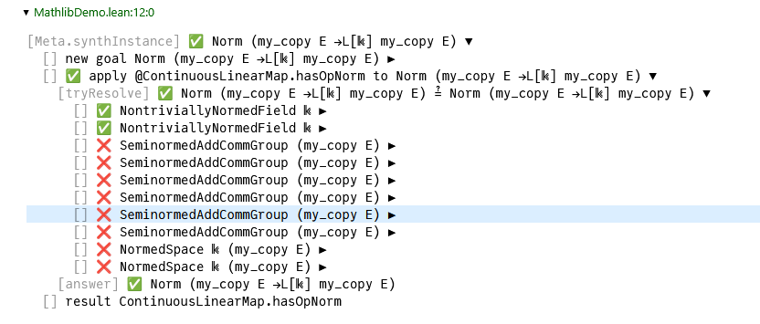 To have a norm on a space of linear maps, you should have a norm on both sides. But there is no norm on my_copy E, it is a type synonym on which I've not registered the norm. The trace shows failure but success, it's very weird.