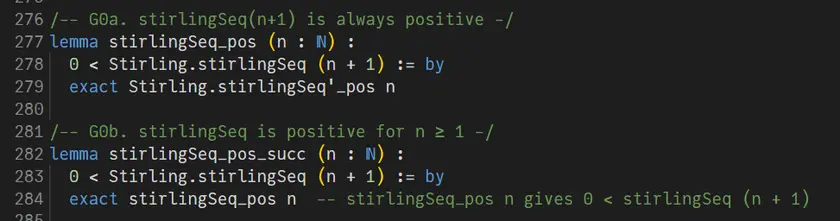 The Mathlib docs note this sharper bound as "not yet formalised, noted at Stirling.le_factorial_stirling.