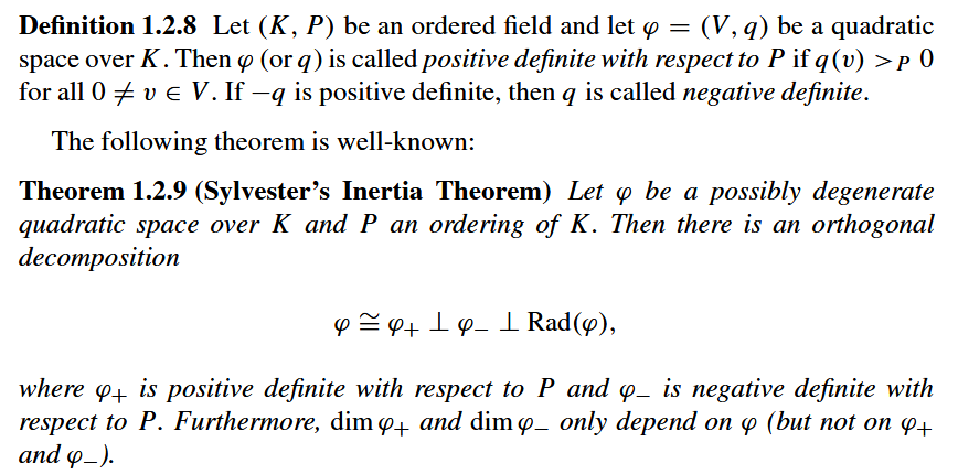 "for any quadratic form there is a basis where the matrix is diagonal, and the number of positive, negative, zero entries are isomorphism invariants of the form"
