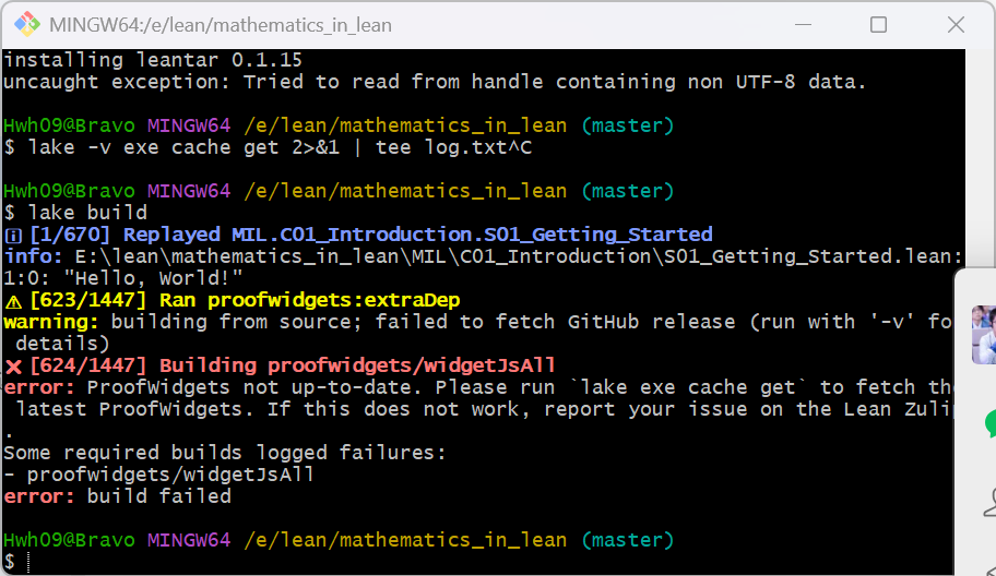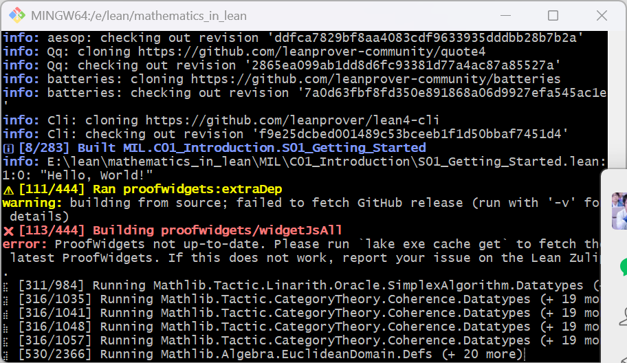 I found the screen shot when I first ran lake build. At first it is normal, cloning mathlib, when it comes to Proofwidget, it gave an error