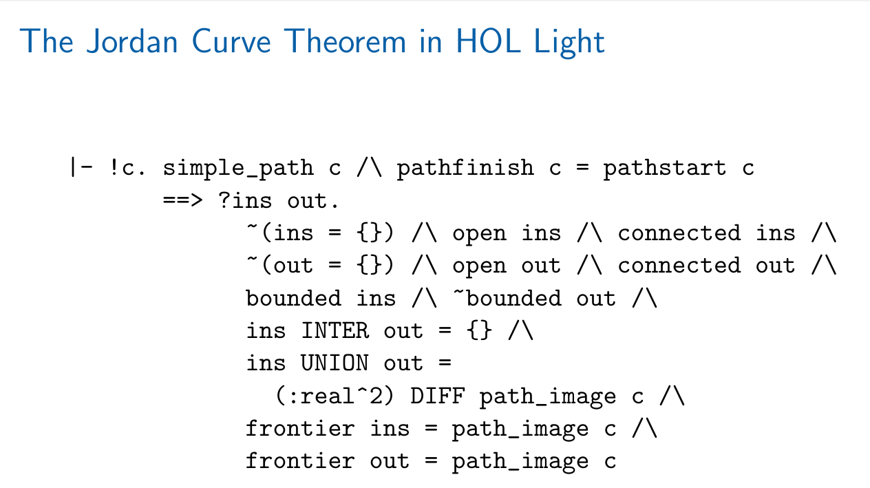 Building on some recent discussion related to this, I'd like to ask the community what we think the statement of the Jordan Curve Theorem will be once it is formalized into mathlib. I'm not sure whether anyone is actually actively working on formalizing the JCT itself, but I think having an agreed-upon statement even without a proof would unlock a lot. For example, I am working on defining the interiors of polygons, but to do this right requires the JCT. So what will the JCT look like? Will the ambient space be only EuclideanSpace ℝ (Fin 2), any manifold homeomorphic to that, or something else? How is the statement itself likely to look?