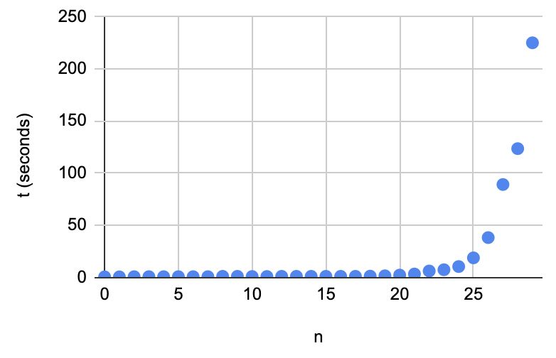 On the playground, 24 took 10ish seconds for me. I did the same thing for the other entries, and here's a plot of the results.