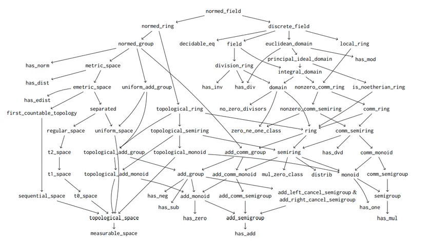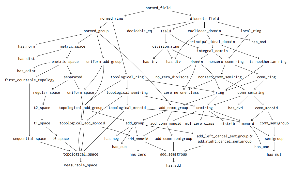 Has anyone made a tree of algebraic typeclass hierarchy? like field -> commring -> ring -> semiring, might also be helpful to include the ones with topology