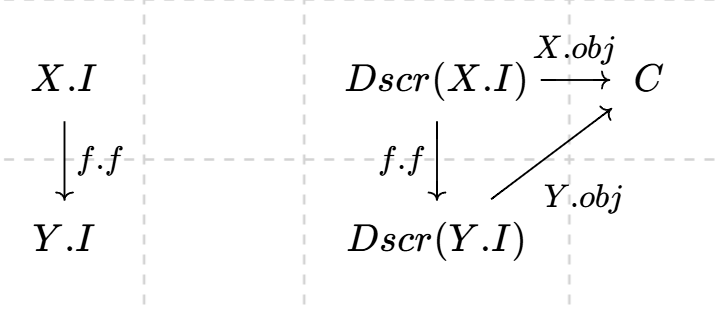 A term X : CostructuredArrow typeToCat C encodes X.I : Type and then X.obj : X.I → C (in the notation of my PR), but a morphism f : X ⟶ Y in the category CostructuredArrow typeToCat C encodes a function f.f : X.I → Y.I such that Y.obj (f.f i) = X.obj i.
