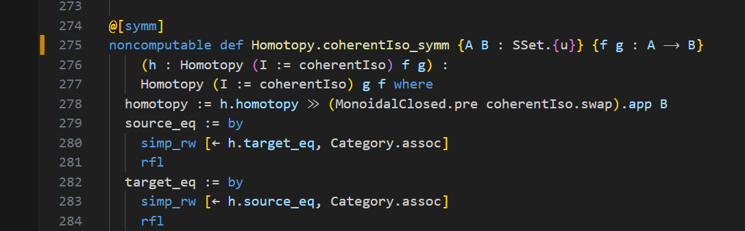 First, SSet.Homotopy is missing a basic API, in particular I'll need a Homotopy.symm lemma.