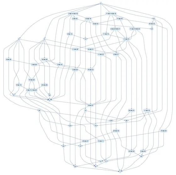 Naively, the space is 4694^3≈103b but after collapsing equivalence classes it is 1420^3≈2.8b. We can do better by a simple algorithm: Fix X<Y. If EqX is a descendant of EqY or vice versa, the problem is already solved (it's simply the implications of the ancestor.) Otherwise, we find EqX and EqY's lowest common ancestors, compute their closures, and subtract the closures of the LCAs from that of EqX and EqY. We must search all of those implications. I conjectured that the reduction would be rather large, but it only reduced the space to ~785m, with a further 2x reduction by duals [unless I'm mistaken, is it sure that if (EqX ∧ EqY) → EqZ that (dual(EqX) ∧ dual(EqY)) → dual(EqZ)?]
