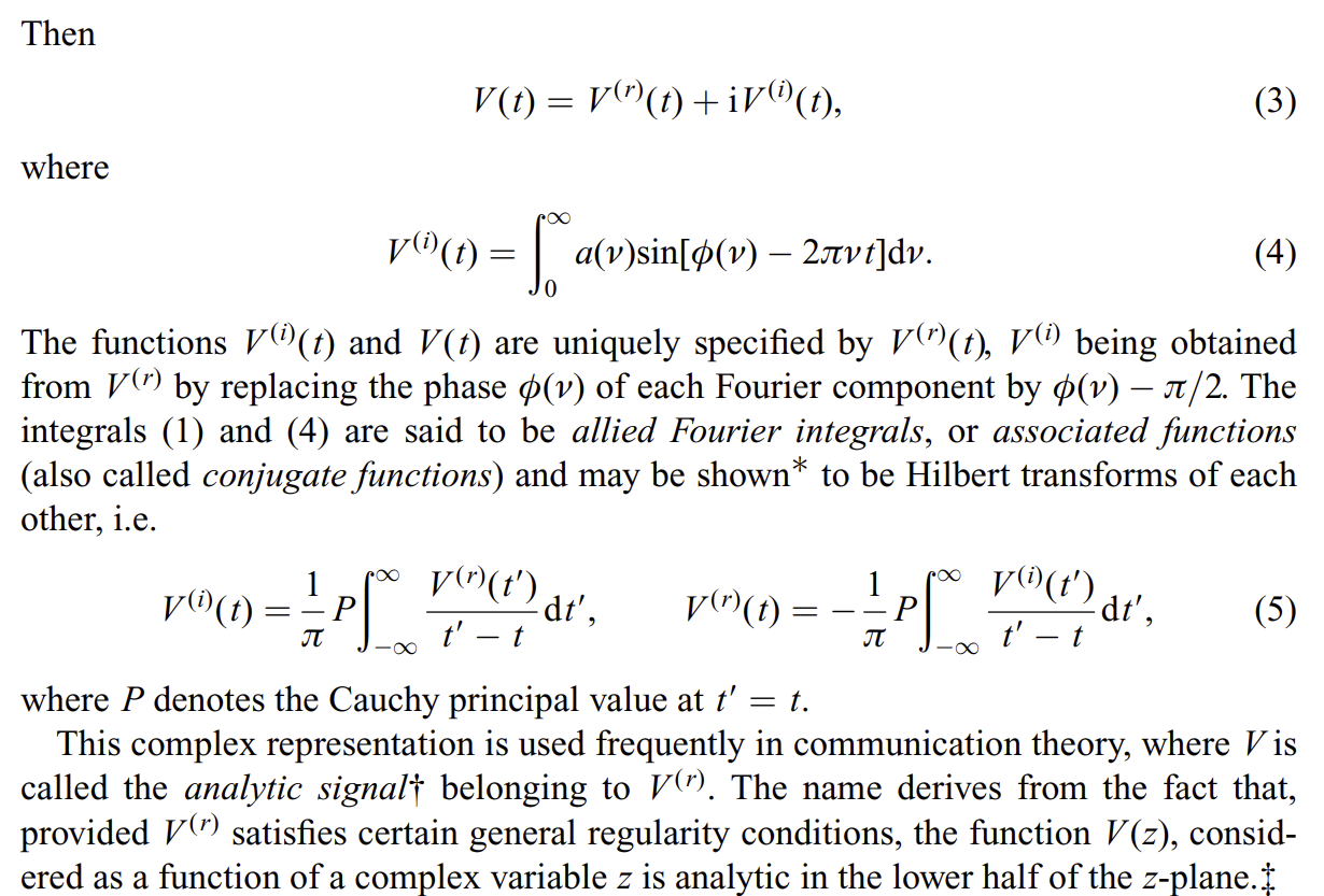 so the premise is this, given a "signal" Vʳ(t) I want to construct a signal V(t) = Vʳ(t) + H(Vʳ(t)) where H is the Hilbert transform. From the text I believe the Hilbert transform is just from a real function to another real function, and the "signal" Vʳ(t) should be square integrable, but I don't know enough about functional anlysis to be certain of this or if there's anything else I'm missing.
