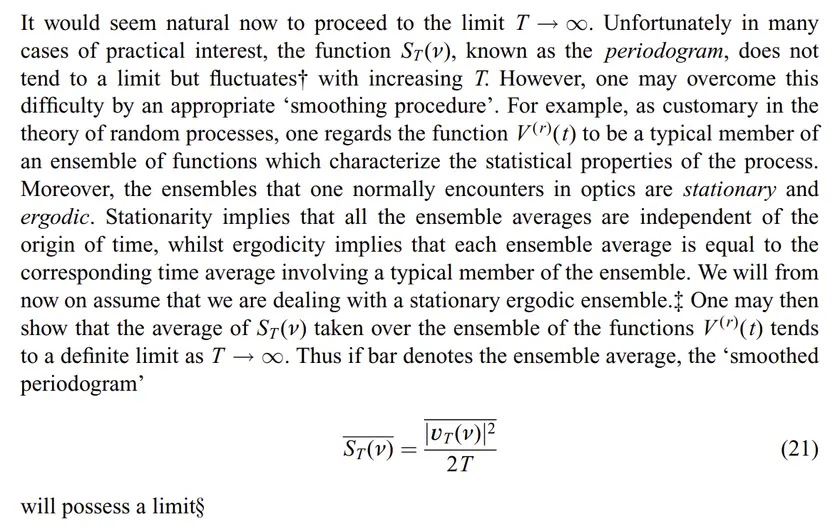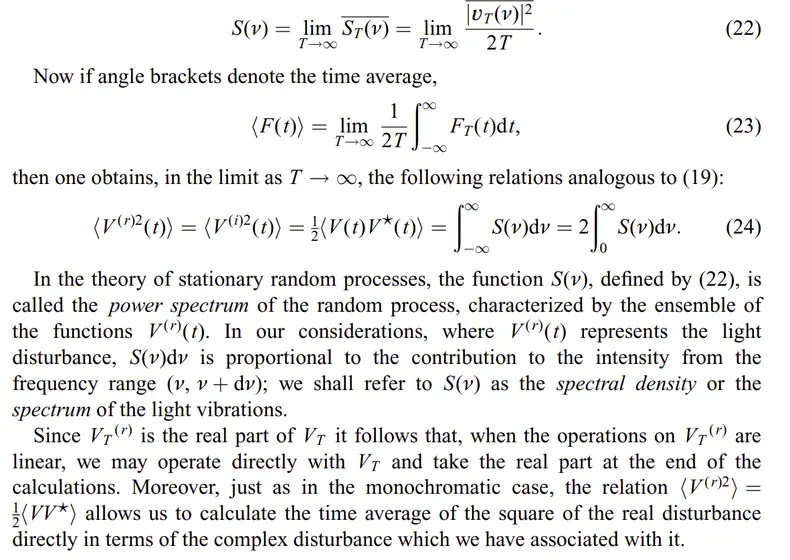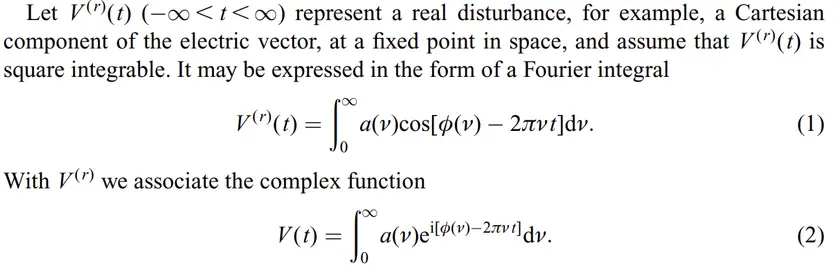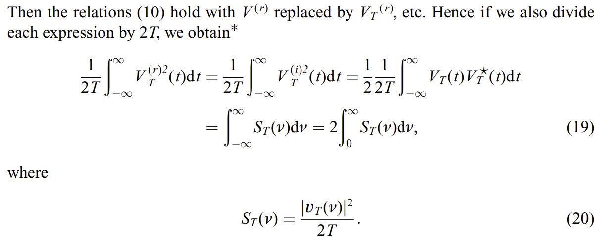 For completeness I'm including those screenshots here for the full exposition. I think at the moment I'll probably ignore the parts about stationary random processes, and show eq (19) holds (time average of complex representation equals the time average of the original real signal). I think there's the more general result that the inner product of two real signals can be calculated by the complex inner product, but I'm not so sure on this one.
