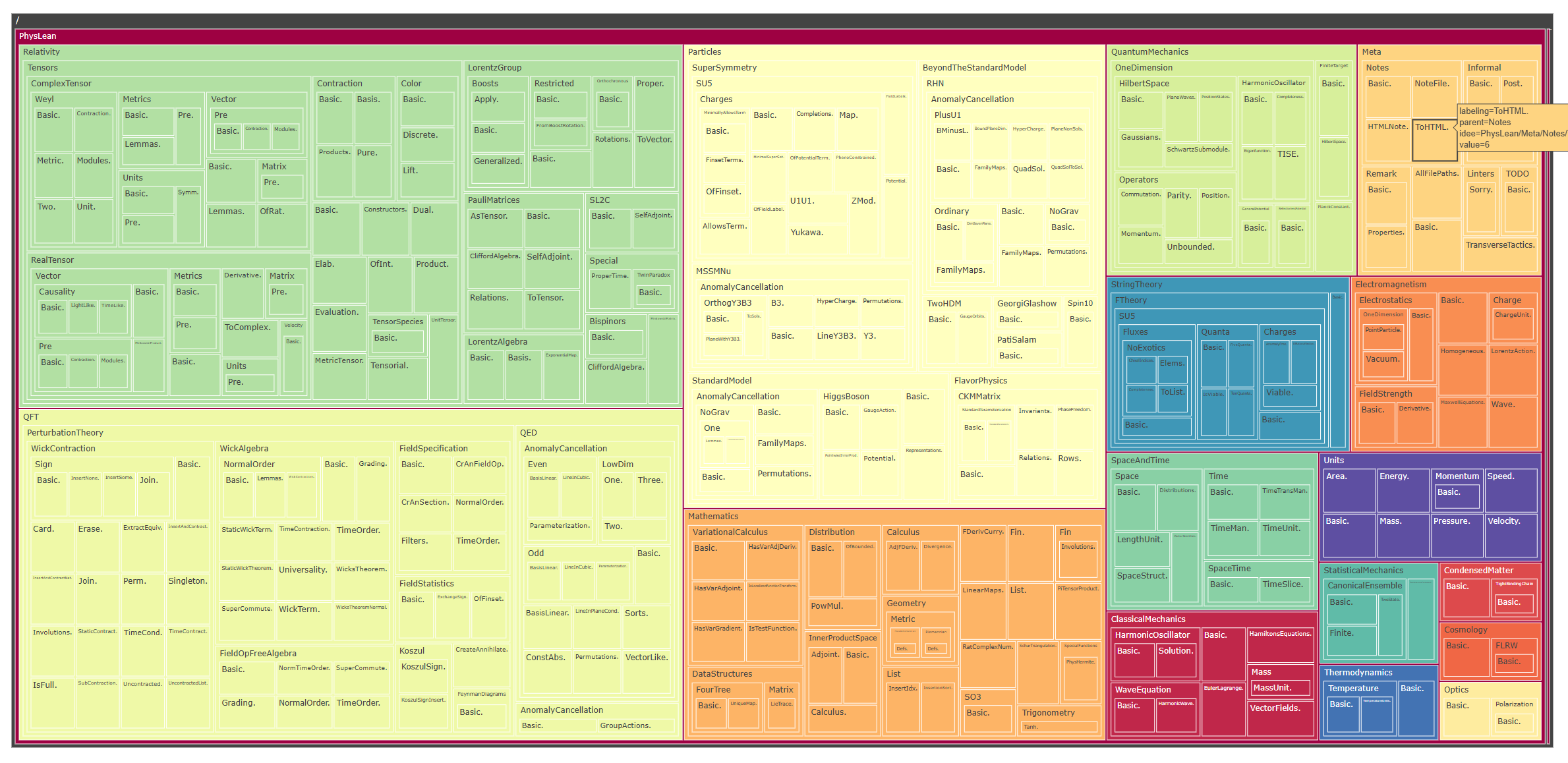 Hi @Taewoo Lee nice to see you here! I think you are thinking about this in terms of individual theorems and proof steps? Here I'm more interested in the global structure of the project e.g. the different topics being worked on, how much covarage each area of physics has etc. Saying that, let me add, that I think (if I've understood correctly) what you may be thinking about already exists in the form of: paperproof .
