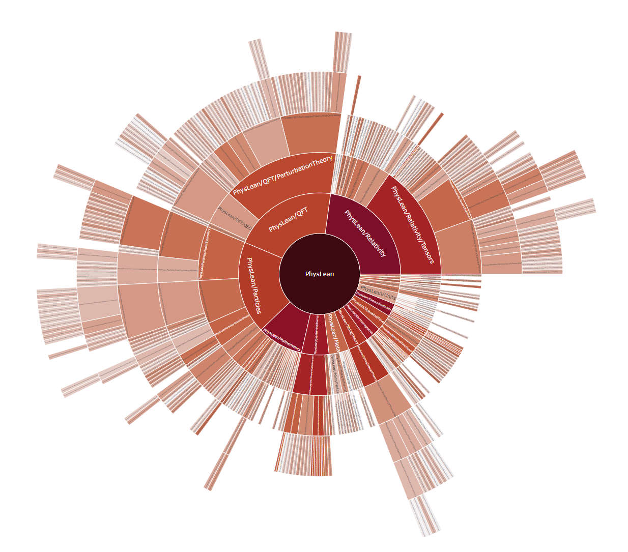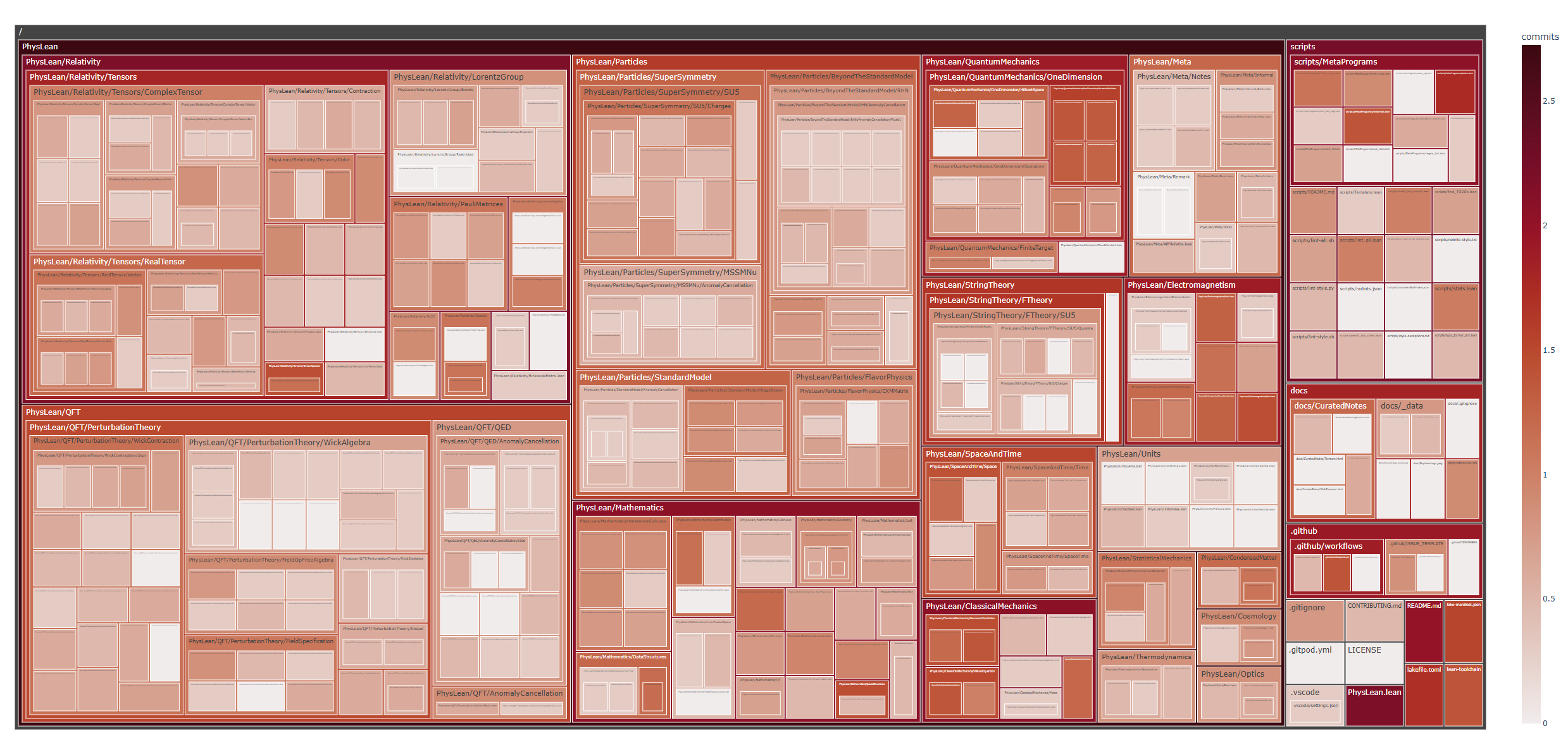 So two separate aims, i found lots of tools online to visualize the meta-data of a repo, this seems reasonable given ubiquity of need of such tools. The easiest one as mentioned in this blog: https://cupprum.github.io/git-render/ (Took 5 mins to setup, two py packages - gitpython to generate the data structure and plotly to generate treemap) generates an interactive tree map and a sunburst where you can keep descending. (The commits are shown on log10 scale). I will share list of some more tools that i feel relevant, like found a tool that shows growth of commits/files over time (https://github.com/wdm0006/git-pandas, though very few stars so needs scrutiny). As to the original problem of generating good visualizations to convey the scope and activity of PhysLean, will need to explore more data visualization tools like plotly as text-visibility is also crucial thereimage.png