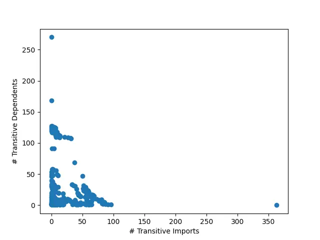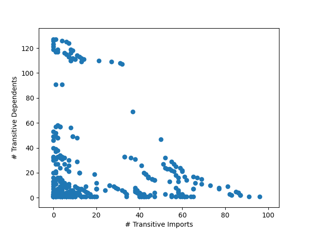 I was able to get some code working for determining the transitive imports and transitive dependents based on the import graph I mentioned above. Here's a test plot of the number of transitive dependents versus the number of transitive imports, and a zoom in excluding the outliers. Does this mean anything? Idk lol