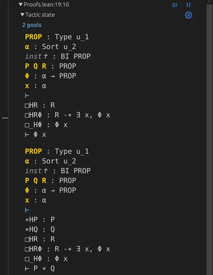 just to clarify the changes I would like to see: the iris tactic mode goal state would look exactly like the current one, except that hypotheses would be above the turnstile and treated exactly like regular hypotheses, including the highlighting and the greying out for inaccessible or shadowed hypotheses, but with boxes and stars before them to indicate that they are persistent or spatial hypotheses