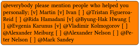 If you are among the authors who don't have access to the Overleaf document, please, send me a private message or leave a comment in this thread, and I will add the acknowledgement and/or the checkmark for you.