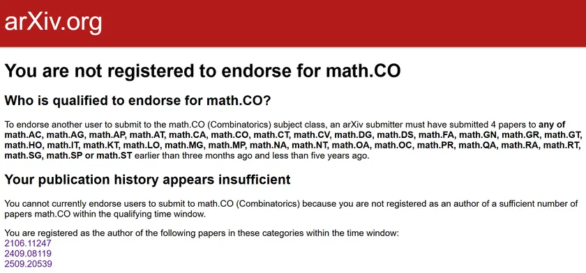 As far as I understand, arXiv endorsement is about subject-area relevance, so it usually requires having a few papers in combinatorics. I haven’t endorsed anyone before, but I do have several papers in combinatorics, so I could try. If you’d like, I can attempt the endorsement using the code above.