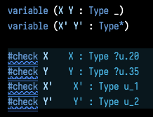 Note also that the autoImplicit feature introduces Sort _, and that may create some subtle universe dependencies, even when it does not look like this is the case.