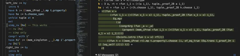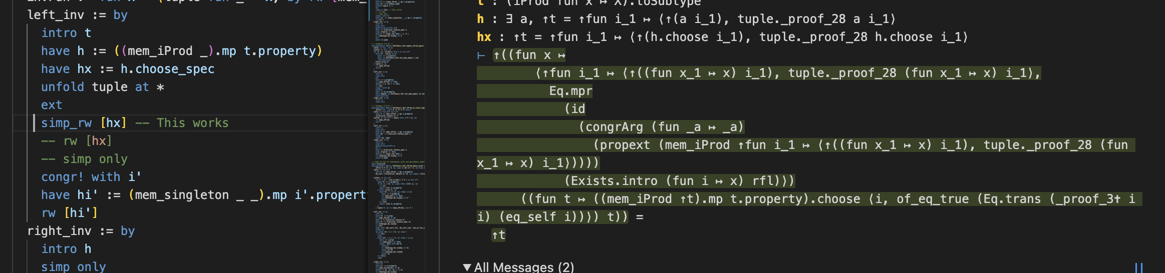 Notably, I had to learn two (!) new tactics. The left inverse seems to require congr! (with a bang) and the right inverse seems to require generalize_proofs.