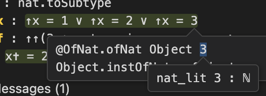 Back to something more concrete. I have h: ↑x = 1 where x: nat.toSubtype and the up arrow (coersion?) is from nat to Object. I want to have x = 1 in nat. Which _inj lemma to use?