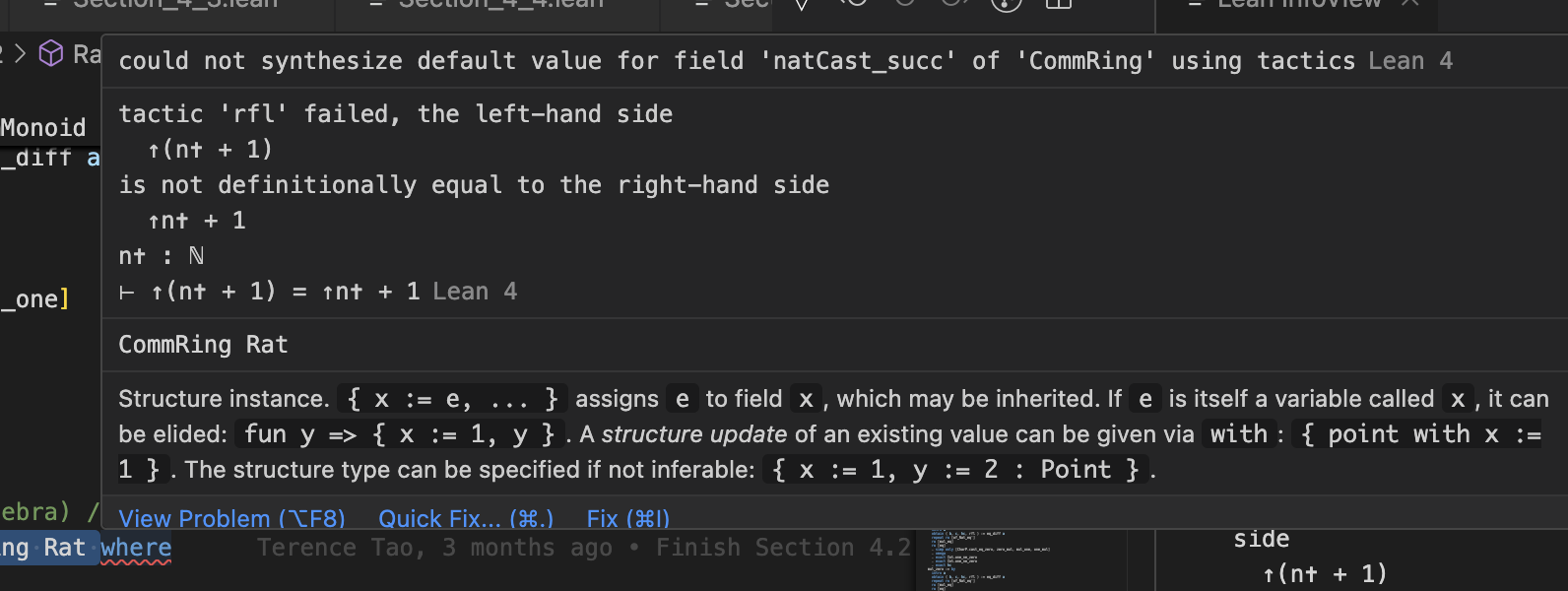 I have added proofs for the 5 axioms needed to turn our homemade Rats into a Commutative Ring - https://github.com/rkirov/analysis/blob/main/analysis/Analysis/Section_4_2.lean#L354-L442. The proofs type-check without error. However, I get an error over the where clause about failure to synthesize a default field natCast_succ.