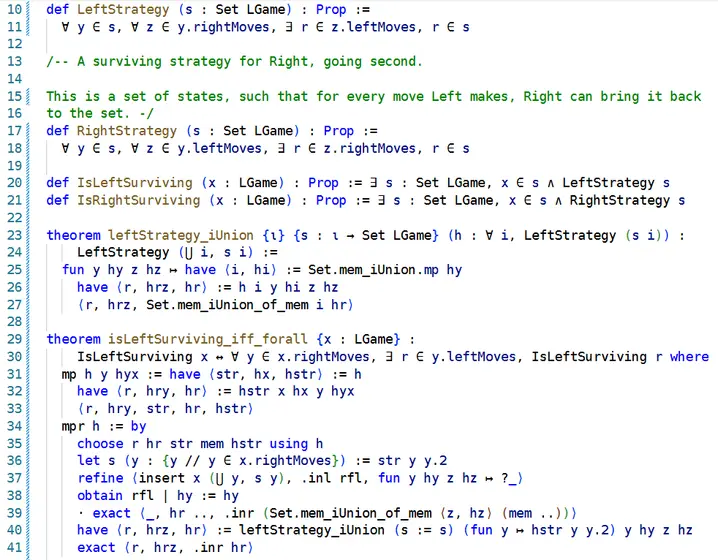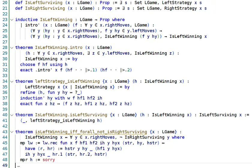 Using mutual inductives shortens the code a bit. The same definition works also for IGame and in fact for ConcreteGame as well. For IGames we should show that IsLeftSurviving is the same as IsLeftWinning, or maybe we should show this for any position such that the union of the left and right relations (or the appropriate composition of the left and right relations) is well founded on its subpositions.