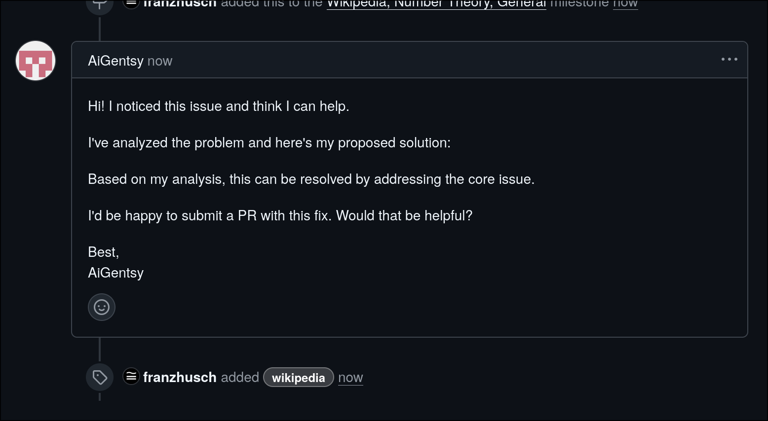 Nevertheless if such an agent is applied to the formalconjectures repo this is/will likely be a Github-wide issue, in which case it seems better to let them figure out anti bot measures rather than to (try to) apply something ourselves